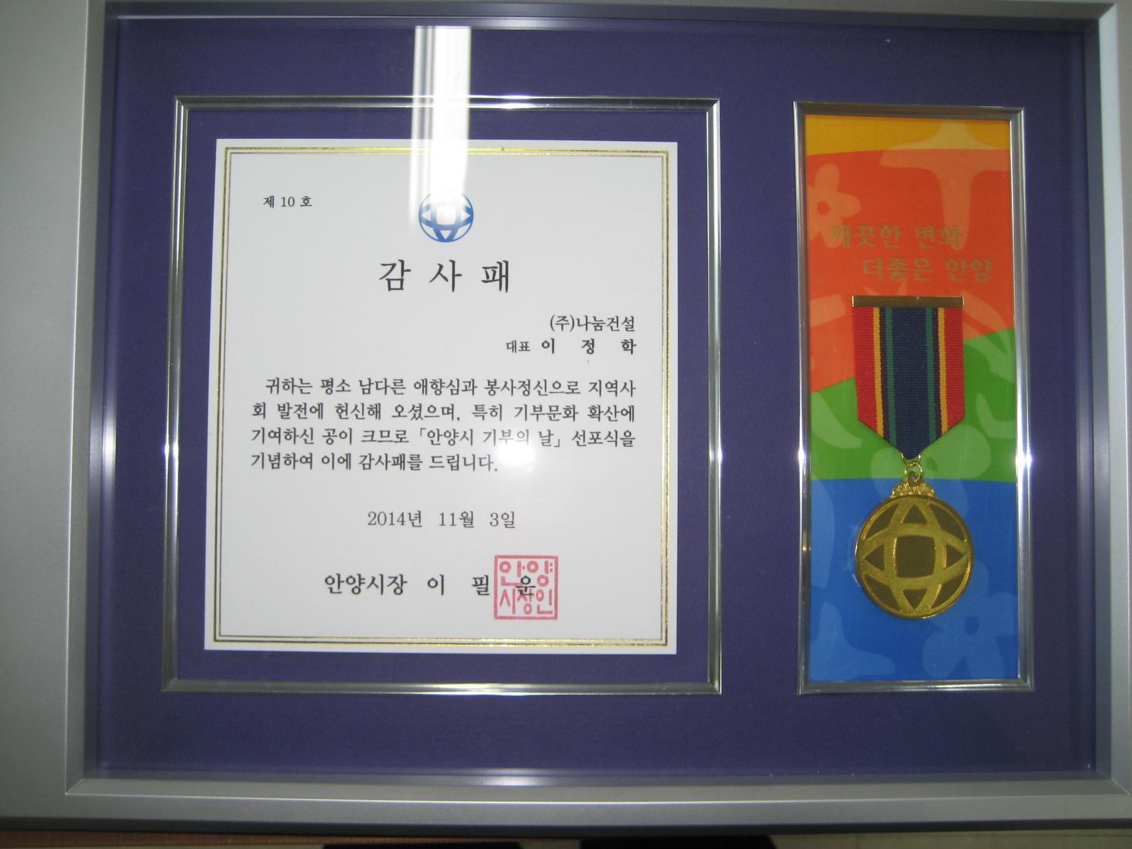 [언론보도] 나눔의 가치를 실천하는 기업 '나눔건설' 2015-06-05 조회수 441 [언론보도] 2014건설협력증진대상 국토교통부장관 표창-나눔건설 2024-11-27 조회수 437 [언론보도] 안양시 '기부의 날'기념식 감사패 전달 2014-11-04 조회수 438 [언론보도] 나눔의 가치 알려준 기부천사 8人..."고맙습니다" 2014-11-05 조회수 445 [언론보도] 정기총회서 이정학 대표에 감사패 2014-03-15 조회수 441 [언론보도] (주)나눔건설 기부금 150만원 기탁 2014-03-01 조회수 449 [야유회] 순천만과 남도를 돌며 2015-01-23 조회수 4,598 [야유회] 마니산의 정기를 받으며 2015-01-22 조회수 4,718 언론보도 (주)나눔건설 2015-01-12 조회수 5,802 [언론보도] (주)나눔건설 시사뉴스 기업인 포커스(건설 부문) 2015-01-12 조회수 4,539 감사패 2015-01-12 조회수 4,660 2014 건설 대상(국토교통부 장관상) 2015-01-09 조회수 4,520