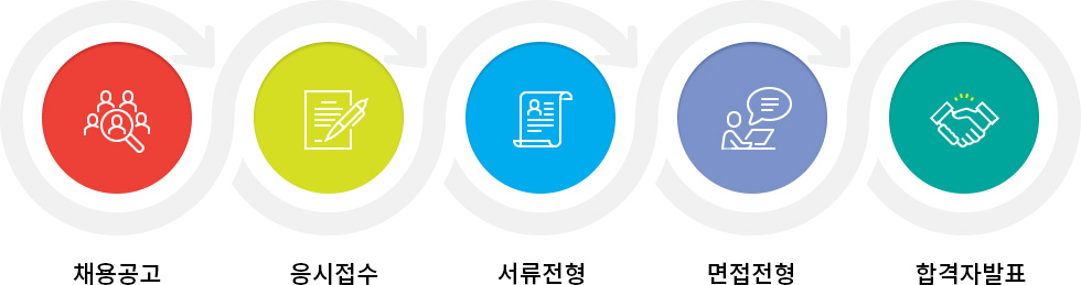 STEP1채용공고 : 당사 홈페이지를 통해 공지함 STEP2응시접수 : 관련서류를 방문 또는 우편을 통해 접수 STEP3서류전형 : 접수서류를 바탕으로 공정하게 심사 STEP4면접전형 : 서류전형 합격자에 한해 면접을 실시 STEP5합격자발표 : 모든 전형을 통과한 최종합격자를 선발하여 홈페이지에 발표 및 개별연락
